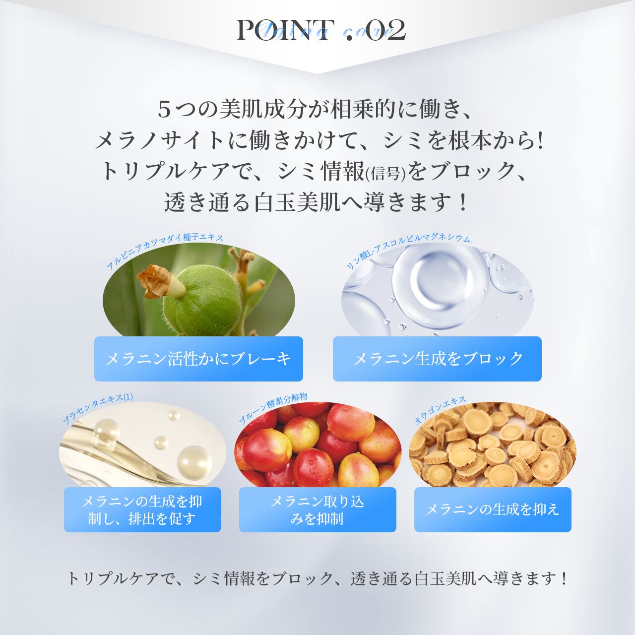 Point2:最新美白理論で医薬部外品配合専用原料アルピニアカツマダイ種子エキスを配合し、メラニンプレーキを活性化‼