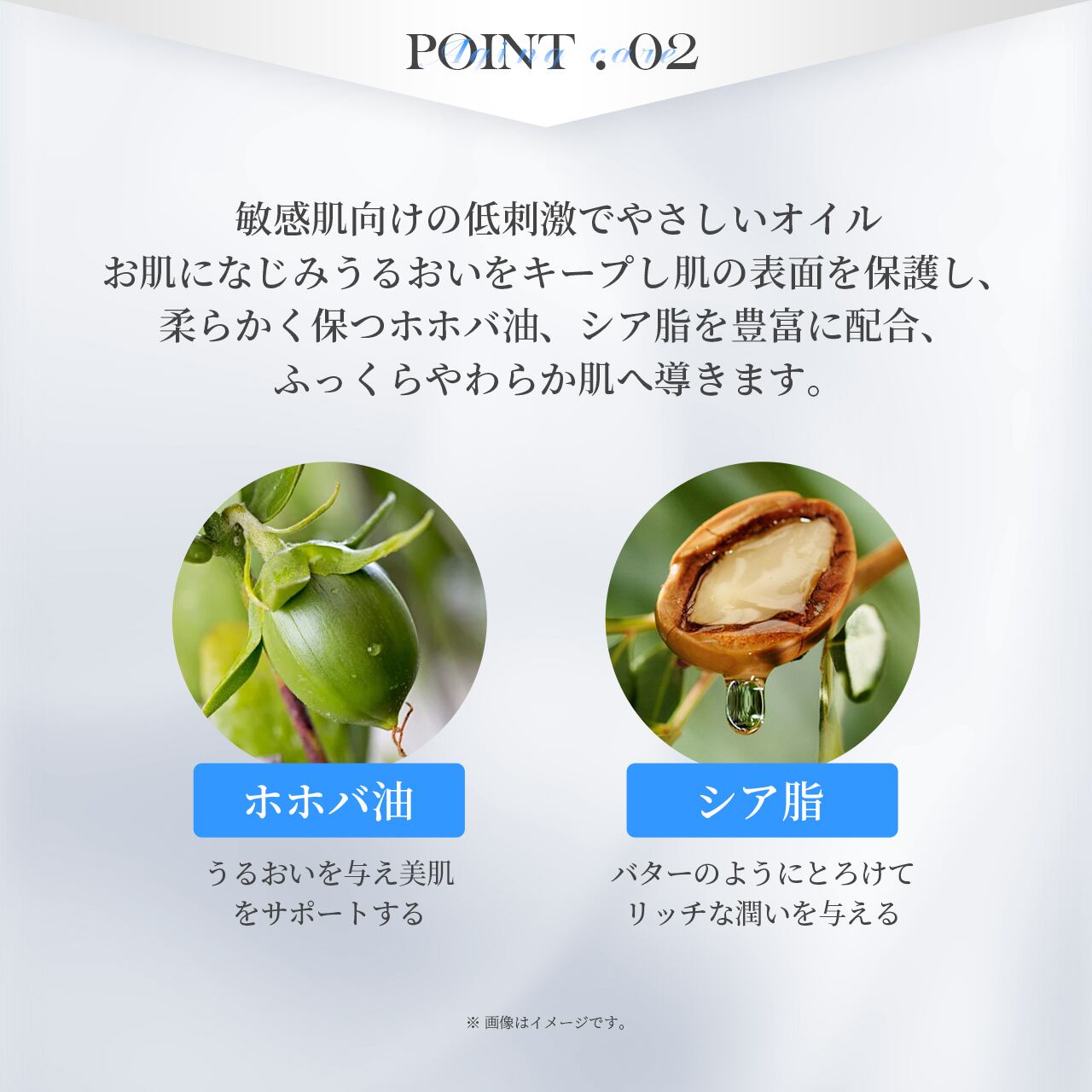 その他の成分として、シア脂やスクワラン、ホホバ油など、肌に優しい成分がたっぷりと配合されています。これにより、肌の保湿力を高め、乾燥を防ぎながら、柔らかく滑らかな肌へと導きます。