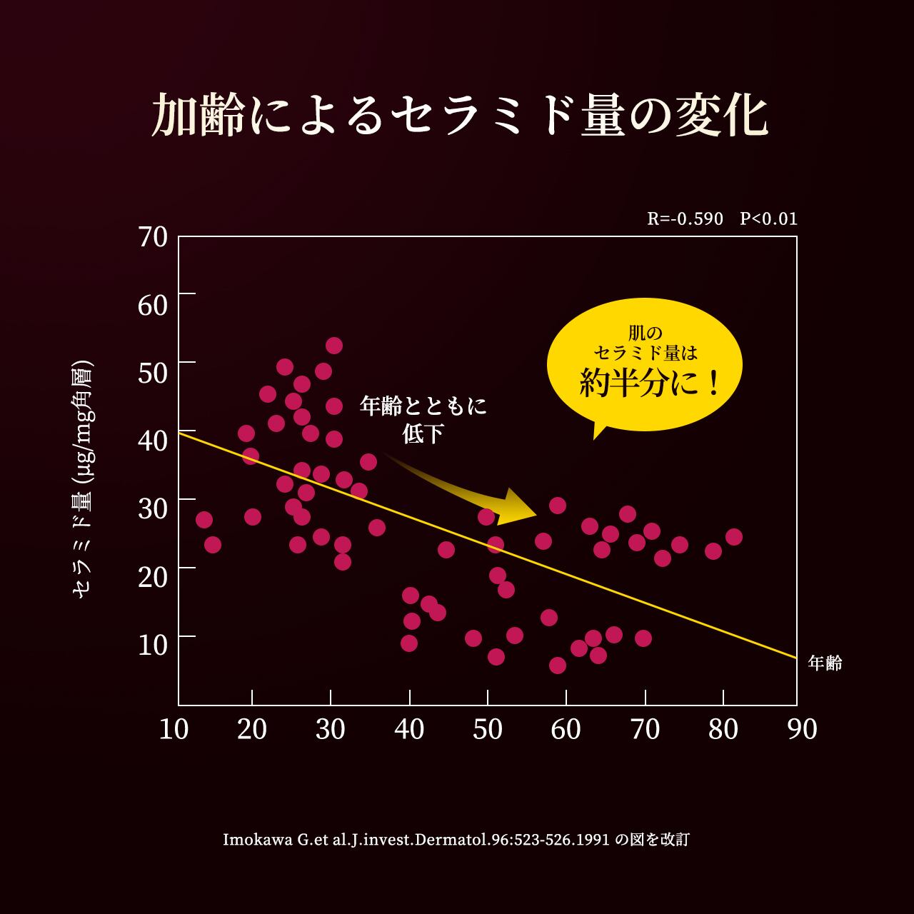 「セラミド」は角層細胞の隙間を満たし、肌バリアや保湿に重要な役割を果たしている成分。年齢とともに減少し、50代の肌のセラミドは20代の約半分と言われています。