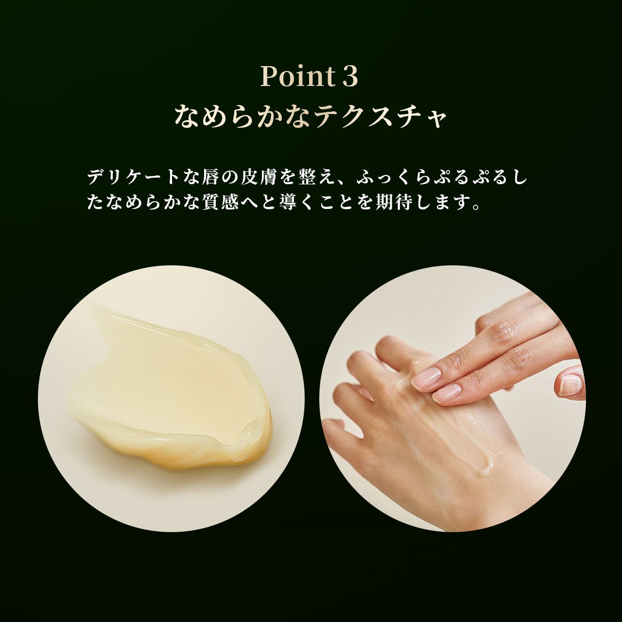 デリケートな唇の皮膚を整え、ふっくらぷるぷるしたなめらかな質感へと導くことを期待します。